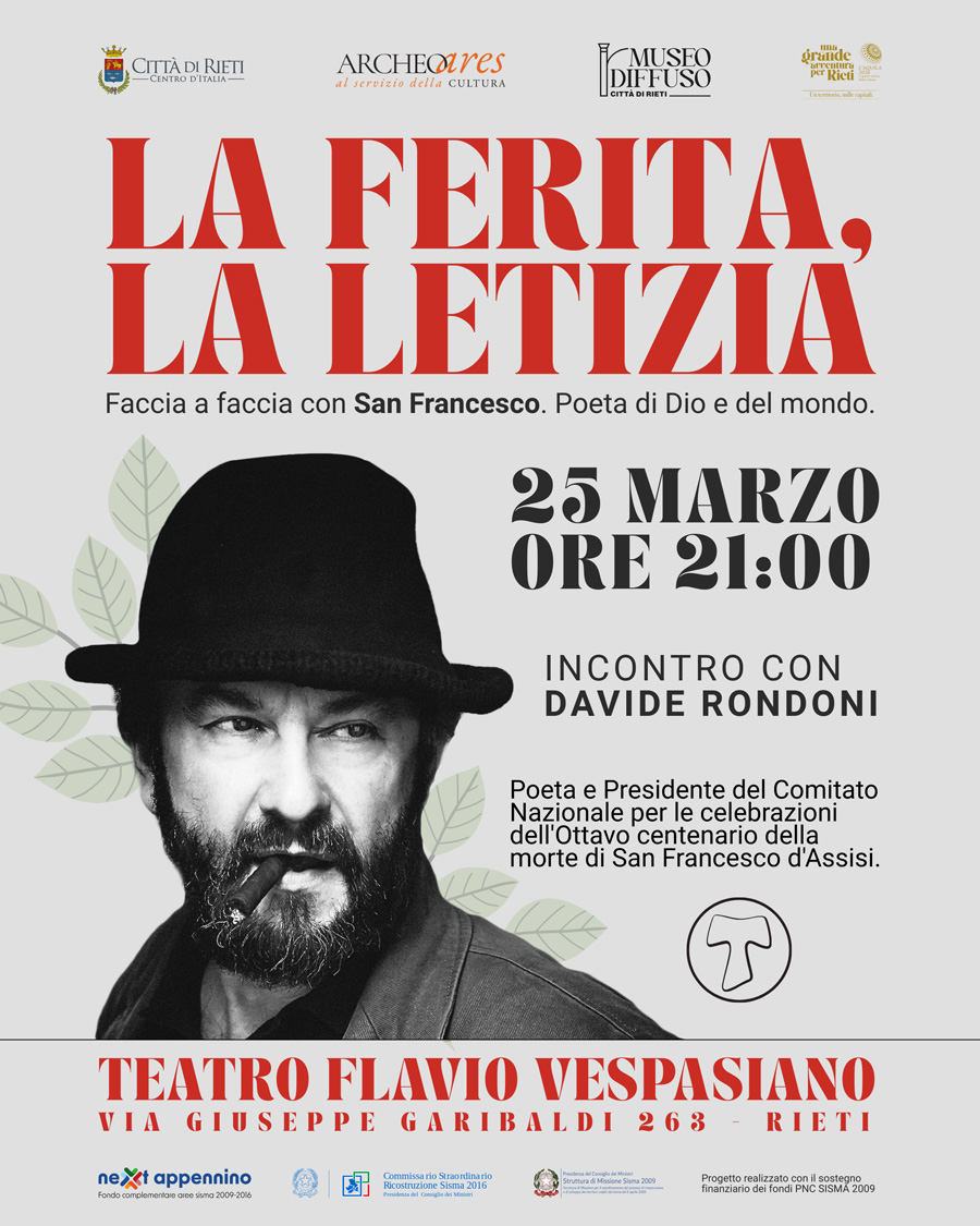Mercoledì 25 marzo, in occasione del Dantedì, il Museo diffuso Città di Rieti, con l’organizzazione di Archeoares e la collaborazione dell’Assessorato alla Cultura, ospiterà la lectio magistralis di Davide Rondoni “La ferita, la letizia” presso il teatro Vespasiano di Rieti.